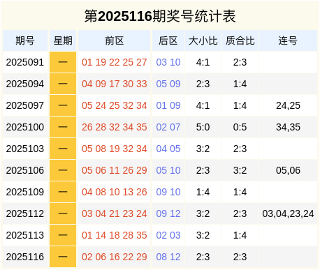 大乐透近十周同星期奖号统计表