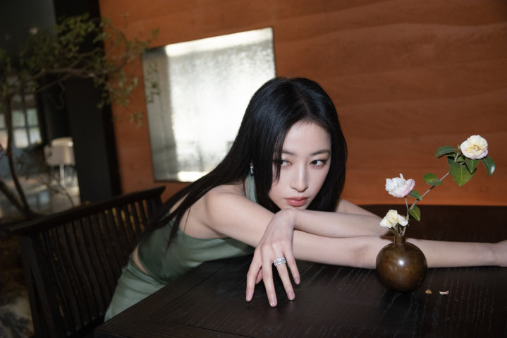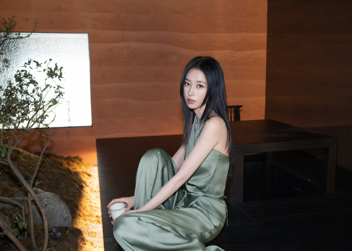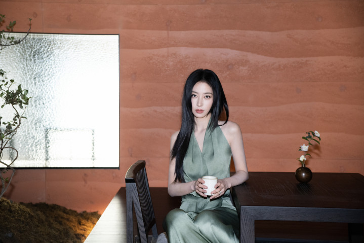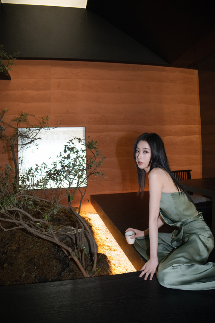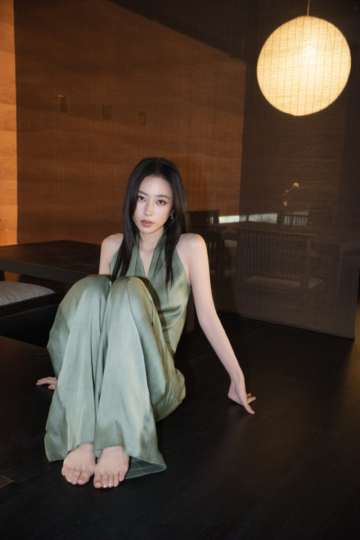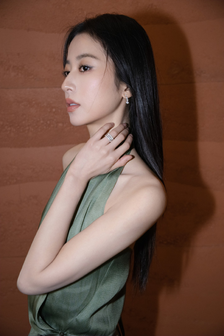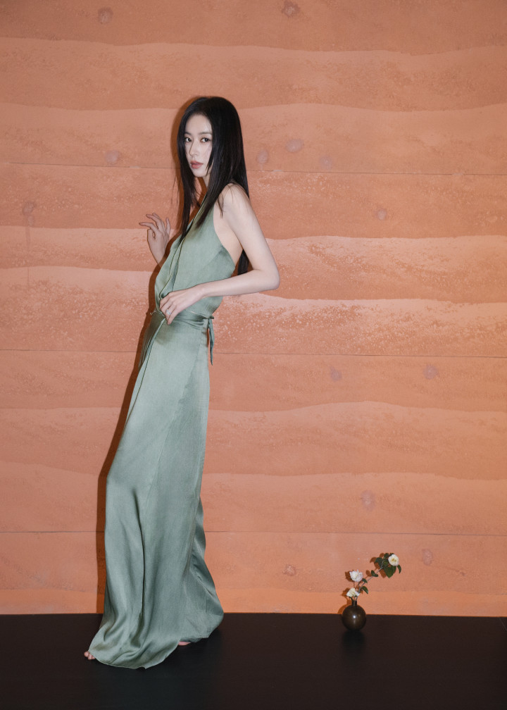 独特的挂颈设计巧妙勾勒出流畅肩颈线和精致锁骨,搭配利落低马尾,全程零多余配饰点缀,反而把清雅复古的知性气质拉到极致。现场无修生图里,浅绿底色衬得她冷白皮肤通透细腻,眼神疏离又灵动,网友清一色刷屏:“自带电影感,清冷感天花板非她莫属!”