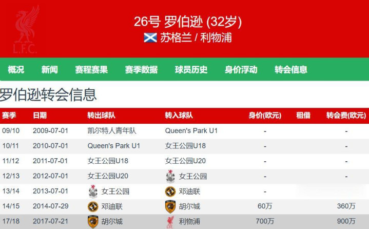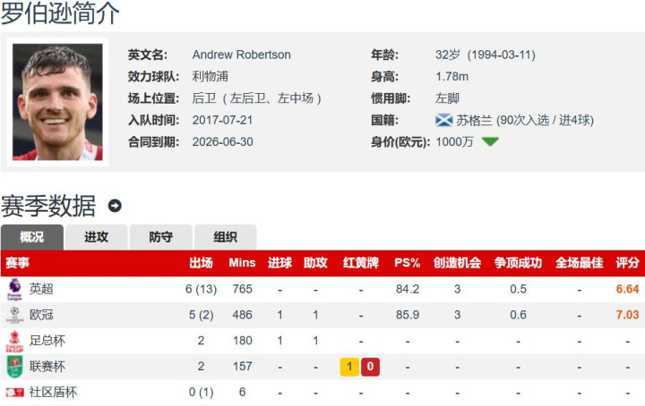 罗伯逊现年32岁,身高1.78米,左脚球员,主打左后卫位置,也可以踢左中场,还是苏格兰队长,与利物浦的合同至今年6月底,德转估价1000万欧元。罗伯逊本赛季在利物浦已经沦为替补,各项赛事出场31次,其中15次首发,贡献2球2助,其中英超仅首发6次。