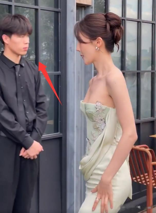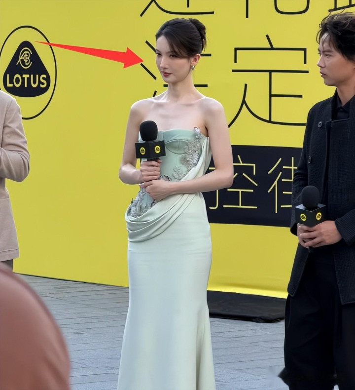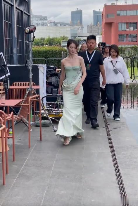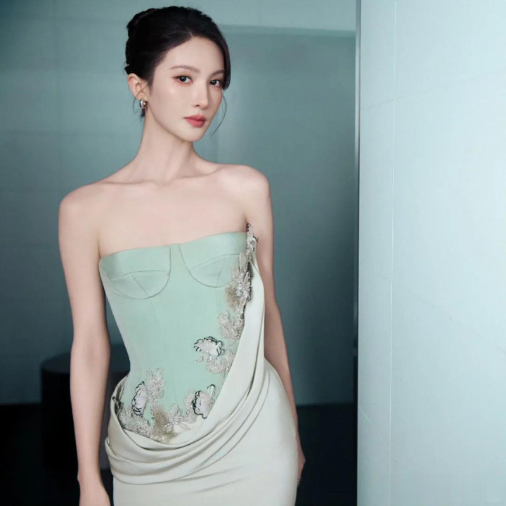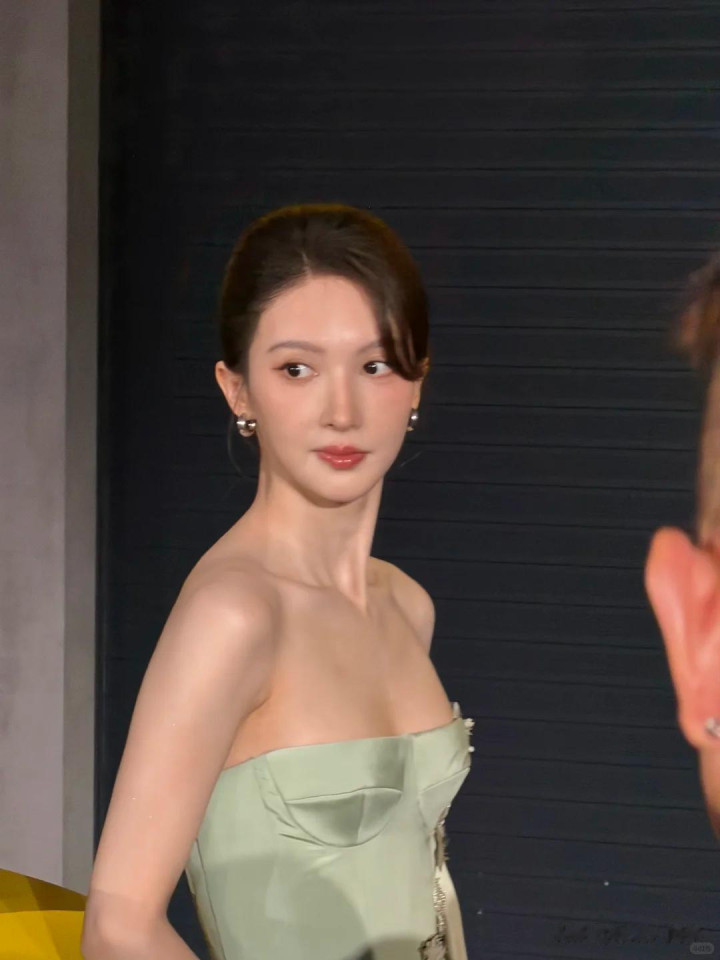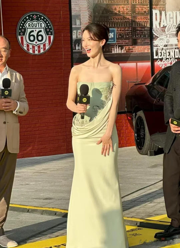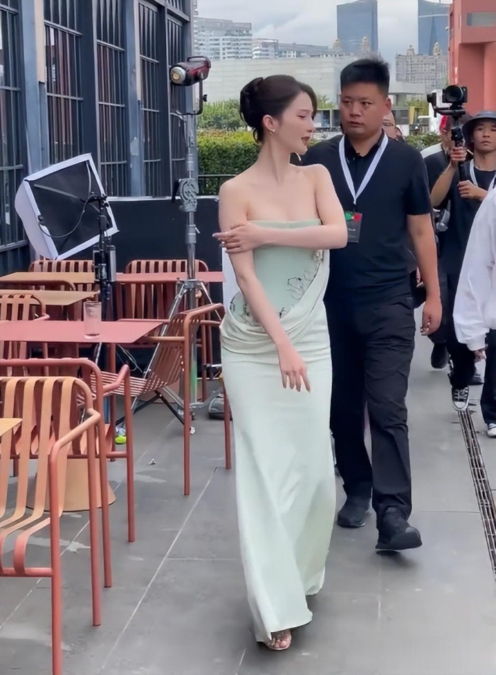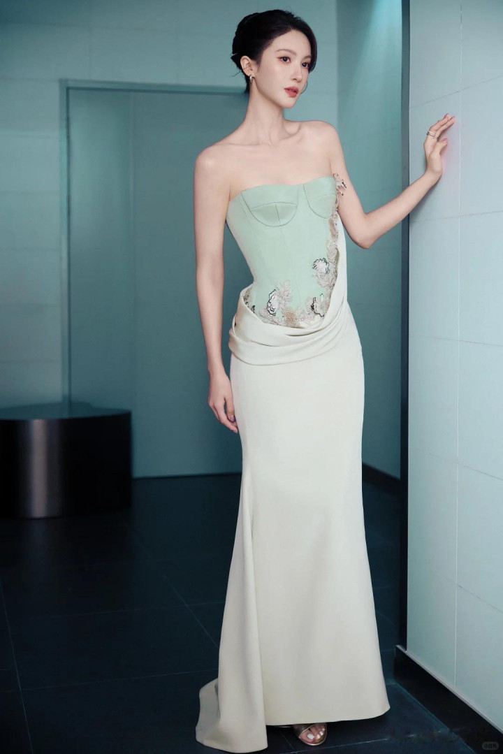金晨穿着一身薄荷绿的抹胸裙,荷叶边的裙摆显得整个人轻盈了许多,而且从腋下到腰身还有一条丝带连接着,看起来更修身了。