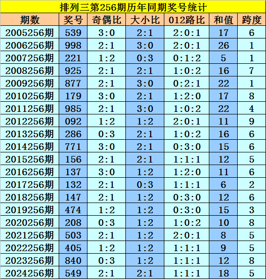 开奖回顾:排列三第2025255期开出奖号583,奖号012路比为1:0:2,大小比为2:1,奇偶比为2:1,最近三年第256期同期开出奖号为:第2022256期:405、第2023256期:840、第2024256期:549。